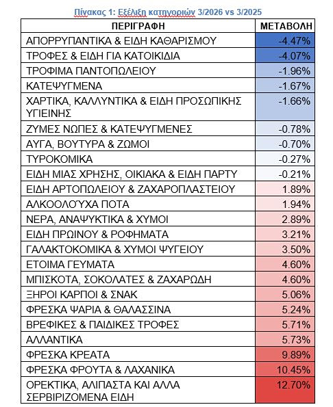 Οι μειώσεις που καταγράφονται είναι αποτέλεσμα τόσο της ομαλοποίησης της αγοράς και της μείωσης στις τιμές παραγωγού σε ορισμένα προϊόντα. Οι μεγαλύτερες μειώσεις καταγράφονται στα απορρυπαντικά και είδη καθαρισμού και στα τρόφιμα παντοπωλείου (η μείωση προέρχεται από τις κατηγορίες του ξηρού τρόφιμου).