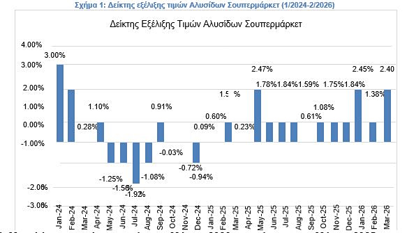 Ο δείκτης τιμών Μαρτίου 2026 σε σχέση με τον προηγούμενο μήνα Φεβρουάριο 2026 είναι μειωμένος κατά -0,15%. Συνολικά το κυλιόμενο 12μηνο (Απρίλιος 2025-Μάρτιος 2026) καταγράφει αύξηση +1,62%.