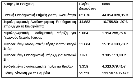 Μετά από συμψηφισμούς της τάξεως των 264.613,16 ευρώ στο σύνολο των κατηγοριών ενισχύσεων λόγω οφειλών παλαιότερων ετών, το συνολικό ποσό των πιστώσεων ανέρχεται σε 201.977.212,74 ευρώ. Οι πληρωμές αφορούν σε ευρύ φάσμα ενισχύσεων, καλύπτοντας δεκάδες χιλιάδες δικαιούχους. Συνολικά, καταβλήθηκαν ενισχύσεις σε 128.063 μοναδικούς δικαιούχους, ενώ έγιναν συμψηφισμοί σε 1.075 μοναδικά ΑΦΜ.