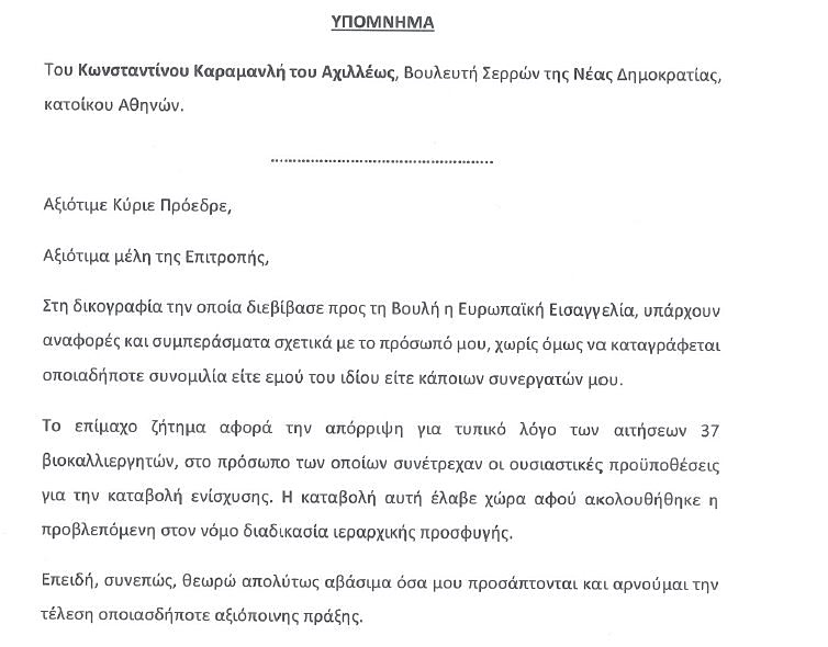 «Θεωρώ απολύτως αβάσιμα όσα μου προσάπτονται και αρνούμαι την τέλεση οποιασδήποτε αξιόποινης πράξης. Επειδή είμαι αθώος και επιθυμώ να αποδείξω την αθωότητά μου όπου κληθώ. Για τους λόγους αυτούς. Σας παρακαλώ όπως εισηγηθείτε υπέρ της άρσης της βουλευτικής μου ασυλίας» υποστηρίζει ο Κώστας Καραμανλής στο υπόμνημά του.