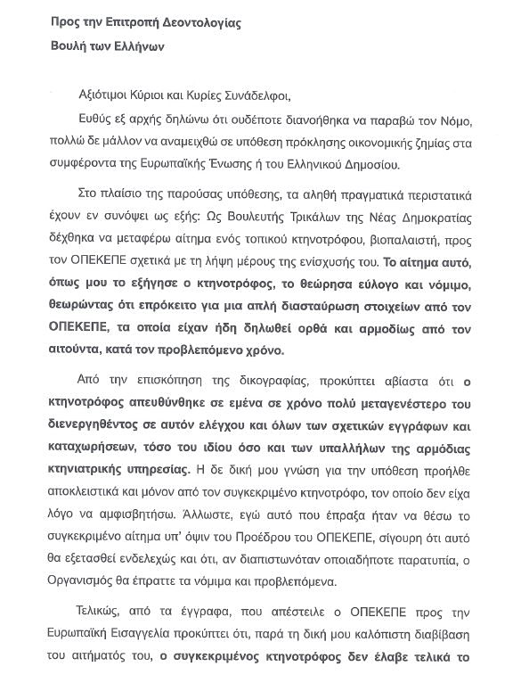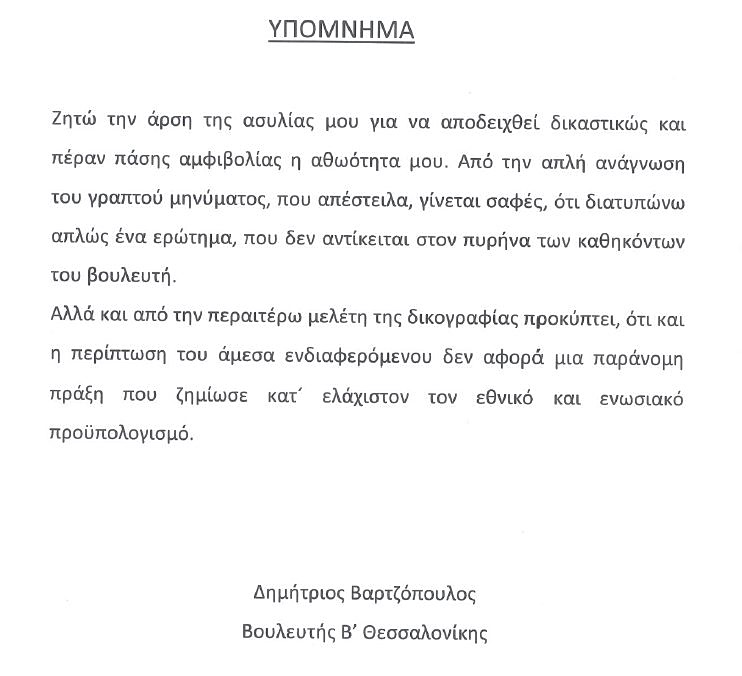 Το υπόμνημα του Δημήτρη Βαρτζόπουλου στην Επιτροπή Δεοντολογίας.