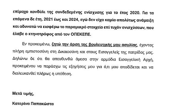 Από την πλευρά της η Κατερίνα Παπακώστα αναφέρει: «Ζητώ την άρση της βουλευτικής μου ασυλίας, έχοντας πλήρη εμπιστοσύνη στη Δικαιοσύνη και στους Εισαγγελείς της πατρίδας μας. Δηλώνω δε ότι θα απευθυνθώ άμεσα στην αρμόδια Εισαγγελική Αρχή, προκειμένου να παράσχω τις εξηγήσεις μου για ό,τι μου αποδίδεται και να διαλευκανθεί πλήρως η υπόθεση».