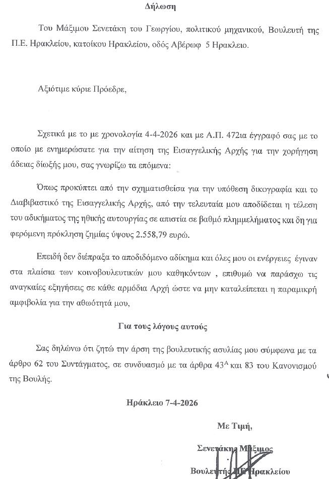 «Επειδή δεν διέπραξα το αποδιδόμενο αδίκημα και όλες μου οι ενέργειες έγιναν στα πλαίσια των κοινοβουλευτικών μου καθηκόντων, επιθυμώ να παράσχω τις αναγκαίες εξηγήσεις σε κάθε αρμόδια Αρχή ώστε να μην καταλείπεται η παραμικρή αμφιβολία για την αθωότητά μου. Σας δηλώνω ότι ζητώ την άρση της βουλευτικής ασυλίας μου σύμφωνα με τα άρθρο 62 του Συντάγματος, σε συνδυασμό με τα άρθρα 43^ και 83 του Κανονισμού της Βουλής» σημειώνει ο Μάξιμος Σενετάκης.