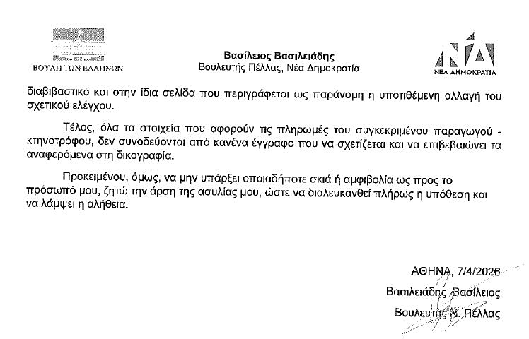 «Προκειμένου να μην υπάρξει οποιαδήποτε σκιά ή αμφιβολία ως προς το πρόσωπό μου, ζητώ την άρση της ασυλίας μου, ώστε να διαλευκανθεί πλήρως η υπόθεση και να λάμψει η αλήθεια» καταλήγει ο βουλευτής Πέλλας, Βασίλης Βασιλειάδης.