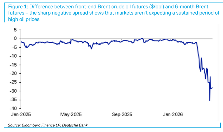 Σύμφωνα με τη Deutsche Bank, αυτή η εικόνα αντανακλά το γεγονός ότι το σημερινό σοκ δεν έχει την ένταση προηγούμενων κρίσεων. Οι αγορές εξακολουθούν να αναμένουν πτώση των τιμών πετρελαίου τους επόμενους μήνες, κάτι που αποτυπώνεται και στην καμπύλη των futures.