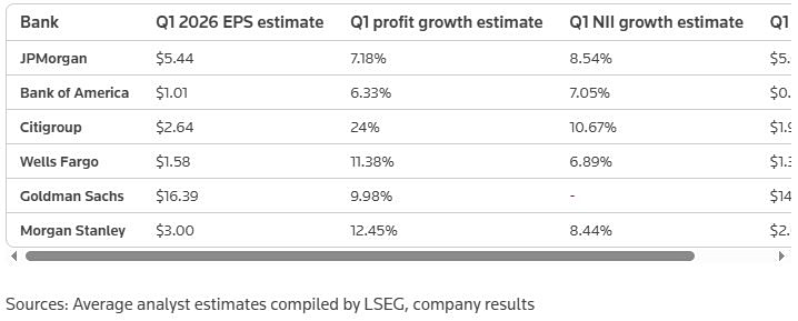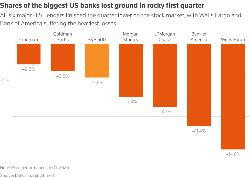 Οι τράπεζες θα δημοσιεύσουν τα αποτελέσματα για το πρώτο τρίμηνο του 2026 (που έληξε στις 31 Μαρτίου), κατά τη διάρκεια του οποίου οι παγκόσμιες αγορές παρουσίασαν έντονες διακυμάνσεις, καθώς οι επενδυτές προσπαθούσαν να αντιμετωπίσουν την αβεβαιότητα που συνδέεται με τους πολέμους στη Μέση Ανατολή και την Ουκρανία, τις διακυμάνσεις στις τιμές του πετρελαίου και τους ευρύτερους γεωπολιτικούς κινδύνους.