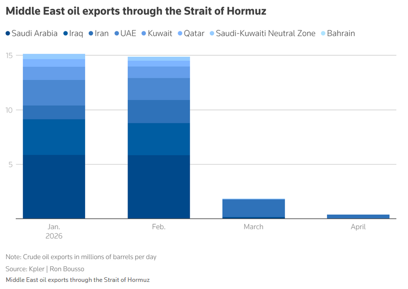 Οι εξαγωγές πετρελαίου από τη Μέση Ανατολή μέσω του Ορμούζ κατέρρευσαν κατά περίπου 13 εκατομμύρια βαρέλια ημερησίως τον Μάρτιο, ποσότητα που αντιστοιχεί περίπου στο 13% της παγκόσμιας κατανάλωσης, σύμφωνα με την Kpler. Παρότι η Σαουδική Αραβία και τα Ηνωμένα Αραβικά Εμιράτα κατάφεραν να εκτρέψουν μέρος των φορτίων μέσω εναλλακτικών διαδρομών, η διαταραχή ανάγκασε τους παραγωγούς να περιορίσουν την παραγωγή κατά περίπου 7,5 εκατομμύρια βαρέλια ημερησίως.