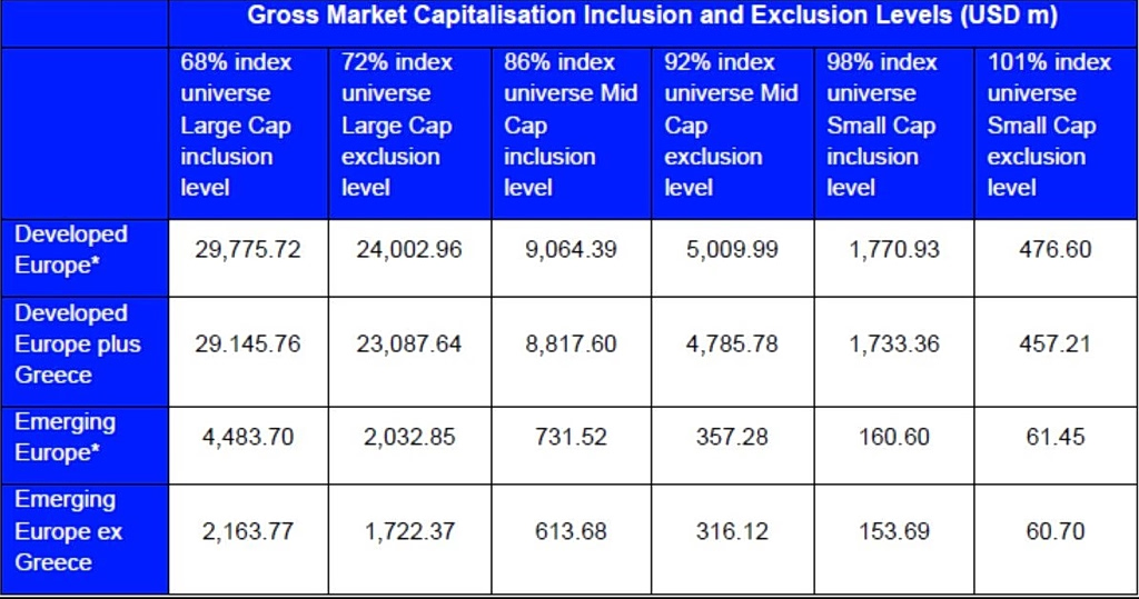 A detailed table accompanying the announcement outlines the gross market capitalization thresholds for stock inclusion and deletion at the regional level, covering both Developed and Emerging Europe, with and without Greece. The data is based on closing figures from December 31, 2025.