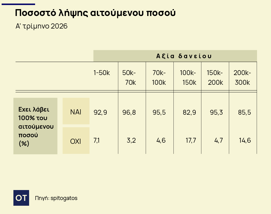 Αντίθετα, μεγαλύτερη απόκλιση μεταξύ αιτούμενου και τελικά εγκριθέντος ποσού εμφανίζεται στις κατηγορίες 100.000-150.000 ευρώ, όπου το 17,1% δεν έλαβε το σύνολο του ποσού που ζήτησε, και 200.000-300.000 ευρώ, με αντίστοιχο ποσοστό 14,6%.