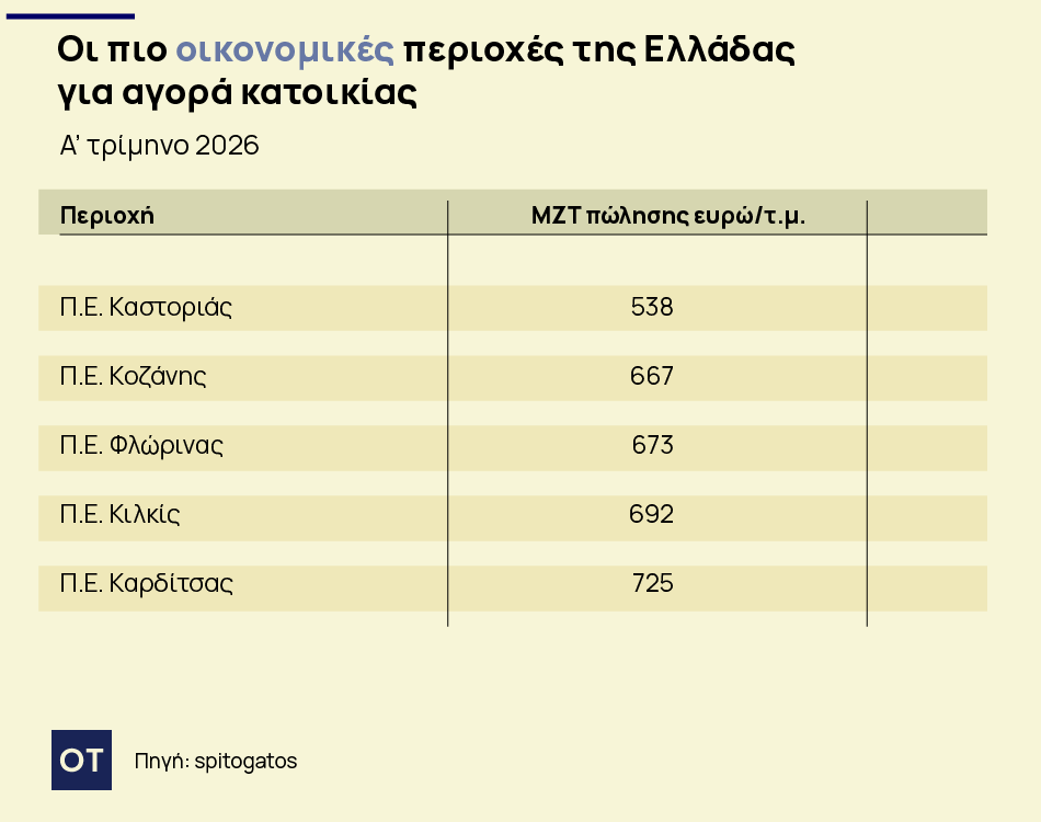 Στον αντίποδα, οι πιο οικονομικές περιοχές της χώρας για αγορά κατοικίας είναι οι εξής: η Π.Ε. Καστοριάς με ΜΖΤ πώλησης στα 538 ευρώ/τ.μ., η Π.Ε. Κοζάνης, η Π.Ε. Φλώρινας, η Π.Ε. Κιλκίς και η Π.Ε. Καρδίτσας.