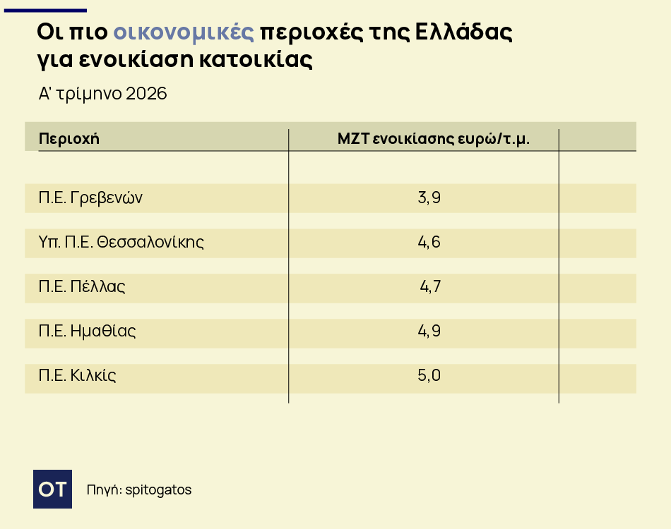 Σε ό,τι αφορά την ενοικίαση κατοικίας, οι πιο οικονομικές περιοχές της χώρας για το 1ο τρίμηνο του 2026 αναδεικνύονται η Π.Ε. Γρεβενών με ΜΖΤ ενοικίασης στα 3,9 ευρώ/τ.μ., ενώ ακολουθούν το υπόλοιπο της Π.Ε. Θεσσαλονίκης, η Π.Ε. Πέλλας, η Π.Ε. Ημαθίας και η Π.Ε. Κιλκίς.