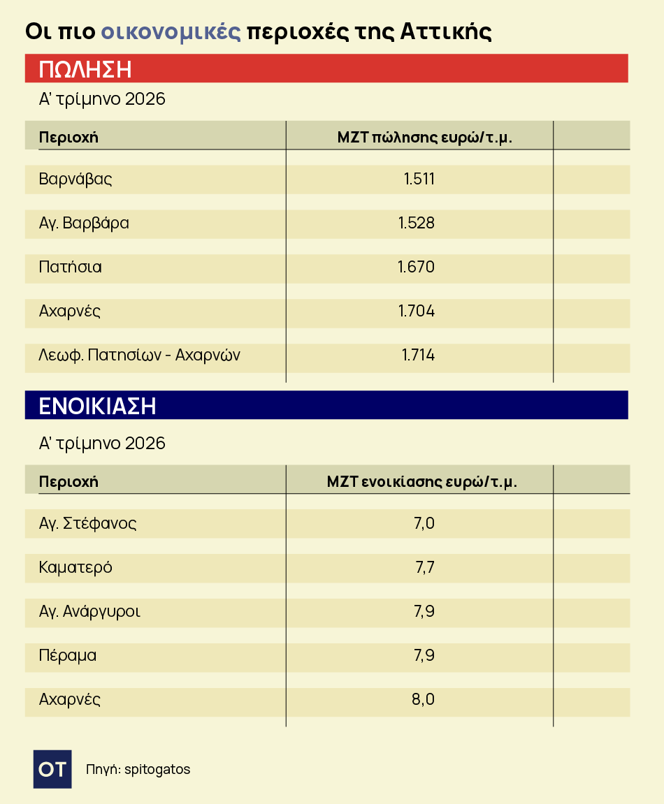 Στις πιο οικονομικές περιοχές της Αττικής για αγορά κατοικίας βρίσκεται ο Βαρνάβας με ΜΖΤ πώλησης στα 1.511 ευρώ/τ.μ., ενώ ακολουθούν η Αγία Βαρβάρα, τα Πατήσια, οι Αχαρνές και η περιοχή Λεωφόρος Πατησίων-Αχαρνών.