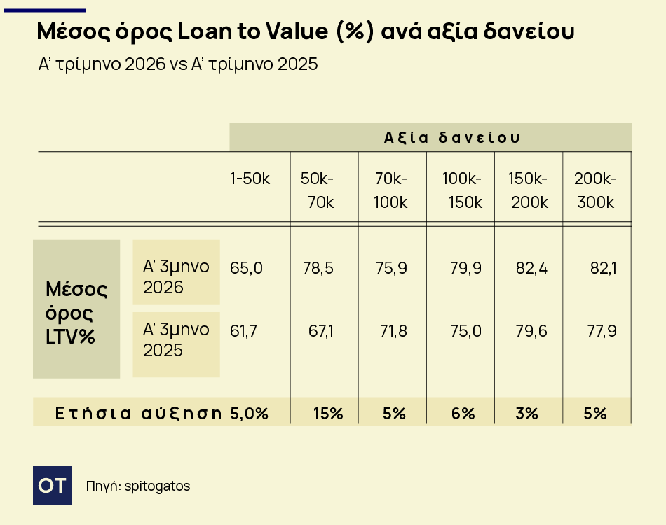 Είναι σημαντικό να σημειωθεί ότι ο δείκτης LTV είναι αυξημένος κατά το 1ο τρίμηνο του 2026 σε όλες τις βαθμίδες αξίας δανείου, με τη σημαντικότερη αύξηση να σημειώνεται στη βαθμίδα 50-70 χιλιάδες ευρώ.