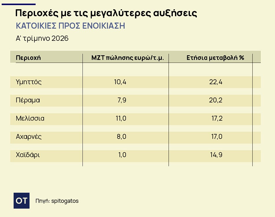 Οι περιοχές που ξεχώρισαν κατά το 1ο τρίμηνο του 2026 για τις σημαντικές αυξήσεις που σημείωσαν στη ΜΖΤ πώλησης κατοικίας σε σχέση με το αντίστοιχο τρίμηνο του 2025 είναι η περιοχή του Υμηττού, ενώ ακολουθούν η Δροσιά, ο Ταύρος, η Δάφνη και η Αγία Βαρβάρα.