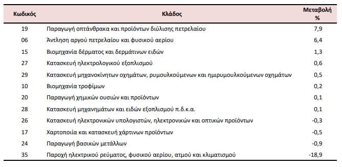 Στην αύξηση του Γενικού Δείκτη Τιμών Εισαγωγών (σύνολο αγοράς) κατά 1,2%, συνέβαλαν κυρίως οι μεταβολές των δεικτών των διψήφιων κλάδων της ταξινόμησης NACE Αναθ. 2, ως εξής: