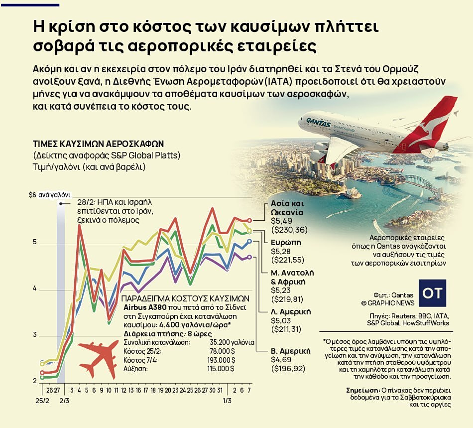 Με κατακόρυφη αύξηση στις τιμές στα καύσιμα έχουν έρθει αντιμέτωπες οι αεροπορικές εταιρείες παγκοσμίως λόγω του πολέμου στο Ιράν. Το κλείσιμο των Στενών του Ορμούζ στις 28 Φεβρουαρίου διατάραξε ριζικά το διεθνές εμπόριο ενέργειας, ανεβάζοντας σημαντικά τις τιμές και στα καύσιμα αεροσκαφών.