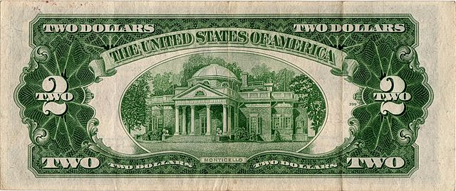 Το Μοντιτσέλο, η κατοικία του Τόμας Τζέφερσον στη Βιρτζίνια, στο πίσω μέρος του χαρτονομίσματος των 2 δολαρίων του 1928
