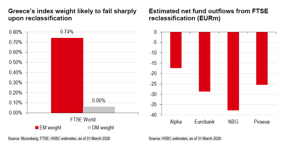 Διχασμένες εμφανίζονται οι απόψεις των επενδυτών σχετικά με το κατά πόσο η αναταξινόμηση των ελληνικών τραπεζών από αναδυόμενες (EM) σε ανεπτυγμένες αγορές (DM) αποτελεί θετική εξέλιξη. Σύμφωνα με την HSBC, η ομάδα στρατηγικής δεικτών εκτιμά ότι η ένταξη στους δείκτες της FTSE Russell θα προκαλέσει καθαρές εκροές κεφαλαίων, ωστόσο το μέγεθός τους θεωρείται διαχειρίσιμο, καθώς αντιστοιχεί σε λιγότερο από μία ημέρα συναλλακτικής δραστηριότητας.