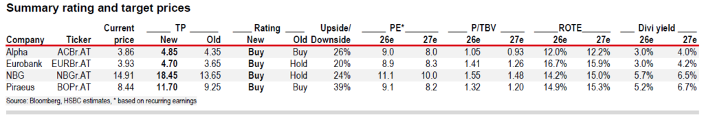 Στο πλαίσιο αυτό, αναβαθμίζει τη σύσταση για την Εθνική Τράπεζα και τη Eurobank σε «Buy», ενώ εξακολουθεί να διατηρεί προτίμηση για την Alpha Bank και την Τράπεζα Πειραιώς.
