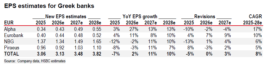 Παράλληλα, η μείωση του κόστους των στεγαστικών δανείων αναμένεται να λειτουργήσει υποστηρικτικά για τη ζήτηση. Ωστόσο, η HSBC διατηρεί συγκρατημένη στάση στις προβλέψεις της, λαμβάνοντας υπόψη γεωπολιτικούς κινδύνους, ιδίως από τη Μέση Ανατολή, καθώς και πιθανές επιπτώσεις στη ναυτιλία, έναν κλάδο με αξιοσημείωτη έκθεση για τις ελληνικές τράπεζες.