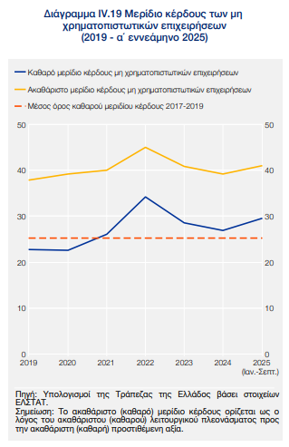 Το ακαθάριστο λειτουργικό πλεόνασμα των μη χρηματοπιστωτικών επιχειρήσεων αυξήθηκε σε ονομαστικούς όρους κατά 7,6% το πρώτο εννεάμηνο του 2025 (έναντι 1,1% την αντίστοιχη περίοδο του 2024), ενώ το καθαρό λειτουργικό πλεόνασμα (που προκύπτει μετά την αφαίρεση της ανάλωσης πάγιου κεφαλαίου) αυξήθηκε κατά 9,7% (έναντι -1,1% το πρώτο εννεάμηνο του 2024).