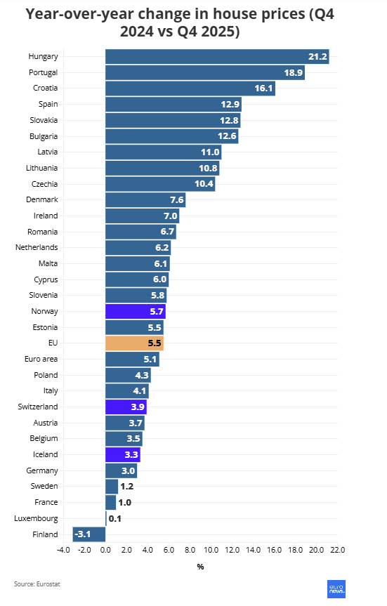 Η Ουγγαρία κατέγραψε την υψηλότερη ετήσια αύξηση στις τιμές των κατοικιών το τέταρτο τρίμηνο του 2025 με άνοδο 21,2%, σύμφωνα με την Eurostat.