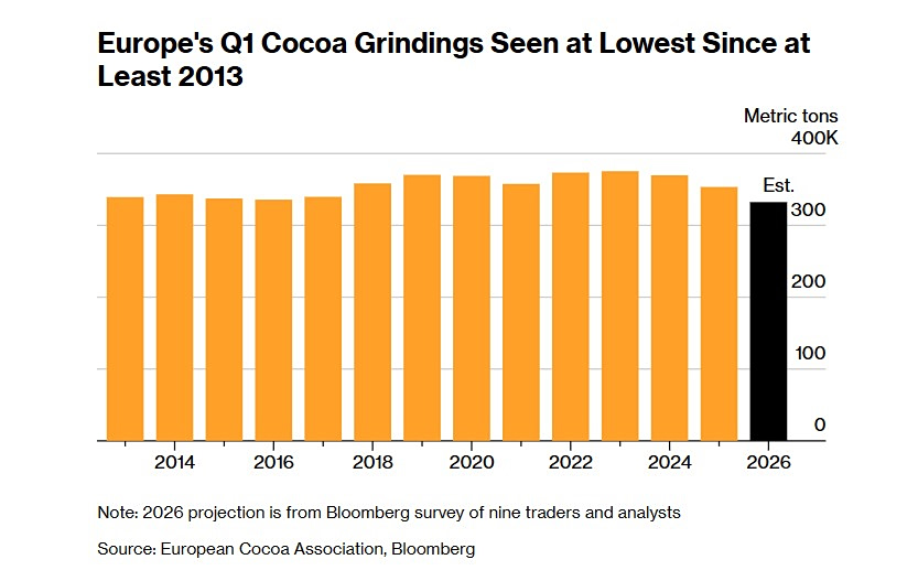 Τα στοιχεία για τον όγκο των κόκκων που οι μεταποιητές μετατρέπουν σε βούτυρο και σκόνη για προϊόντα σοκολάτας, αναμένεται να είναι αδύναμα στο πρώτο τρίμηνο, αλλά «αυτό πιθανότατα θα είναι το τελευταίο τρίμηνο μιας επιβράδυνσης», δήλωσε ο Parkman.