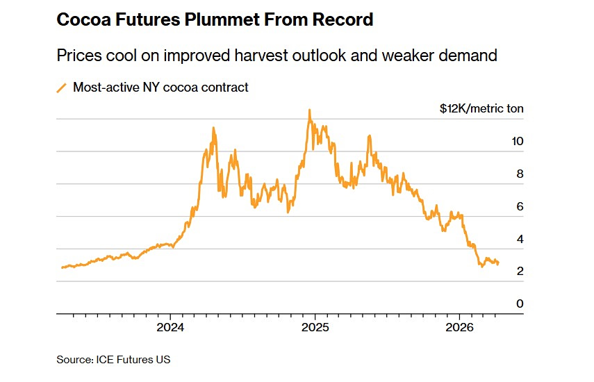 Η καταστροφή της ζήτησης που ακολούθησε, σε συνδυασμό με τις αξιοπρεπείς συγκομιδές, έχει ενισχύσει τις προοπτικές για ένα μεγαλύτερο από το αναμενόμενο πλεόνασμα και έχει μειώσει το πιο ενεργό συμβόλαιο κακάο της Νέας Υόρκης κατά περίπου 75% από το ρεκόρ του.