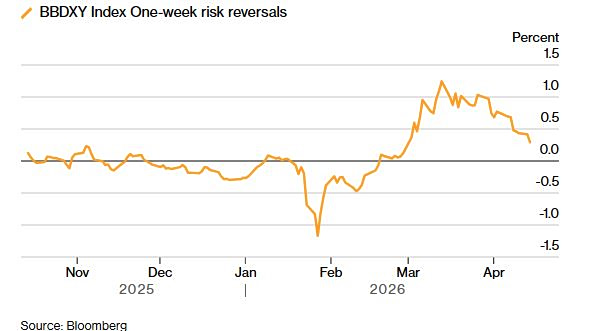 Ταυτόχρονα, οι λεγόμενες αντιστροφές κινδύνου στον δείκτη δολαρίου του Bloomberg δείχνουν ότι το πριμ για τις επιλογές αγοράς — το κόστος αντιστάθμισης έναντι ενός ισχυρότερου δολαρίου — έναντι των επιλογών πώλησης — στοιχήματα έναντι ενός ασθενέστερου δολαρίου — έχει μειωθεί αυτό το μήνα.