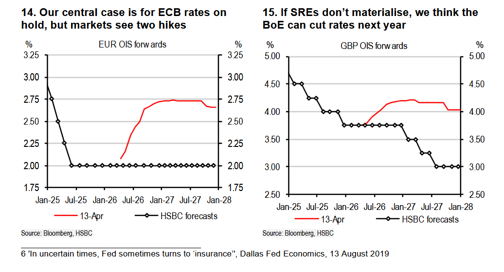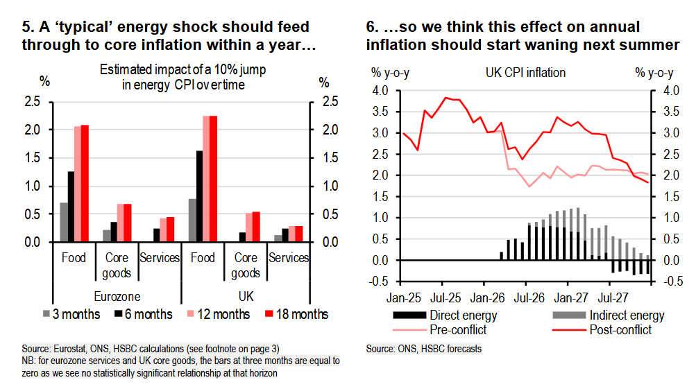 Κατά συνέπεια, η HSBC εκτιμά ότι τόσο η ΕΚΤ όσο και η Τράπεζα της Αγγλίας είναι πιθανότερο να τηρήσουν στάση αναμονής προς το παρόν. Ωστόσο, η πιθανότητα εμφάνισης δευτερογενών επιδράσεων ακόμη και μέσα στο επόμενο έτος σημαίνει ότι οι κίνδυνοι για πιο αυστηρή νομισματική πολιτική παραμένουν.