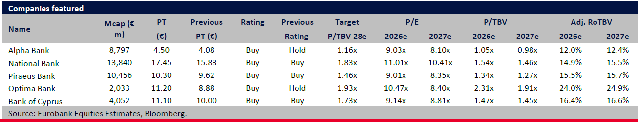 Κατά την Eurobank Equities, το υφιστάμενο discount αποτίμησης θεωρείται υπερβολικό, δεδομένης της ισχυρής ορατότητας κερδών, των καθαρών ισολογισμών και της ισχυρής κεφαλαιακής βάσης, δημιουργώντας περιθώρια επαναξιολόγησης του κλάδου ακόμη και σε πιο συντηρητικό μακροοικονομικό περιβάλλον.