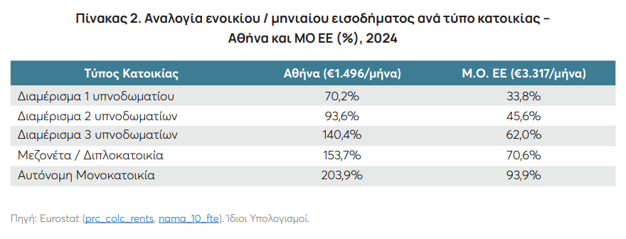 Αντίθετα, η αντίστοιχη αναλογία στον μέσο όρο των πρωτευουσών της ΕΕ είναι σημαντικά χαμηλότερη: 33,8% για 1 υπνοδωμάτιο και 45,6% για 2 υπνοδωμάτια. Αξίζει να υπογραμμισθεί ότι η διαφορά αυτή οφείλεται σε μεγάλο βαθμό στη συμπίεση των χαμηλών ελληνικών μισθών (μηνιαίος μισθός €1.496 έναντι €3.317 για τον μέσο όρο της ΕΕ) με τιμές ενοικίου σε επίπεδο συγκρίσιμο με την υπόλοιπη Ευρώπη.