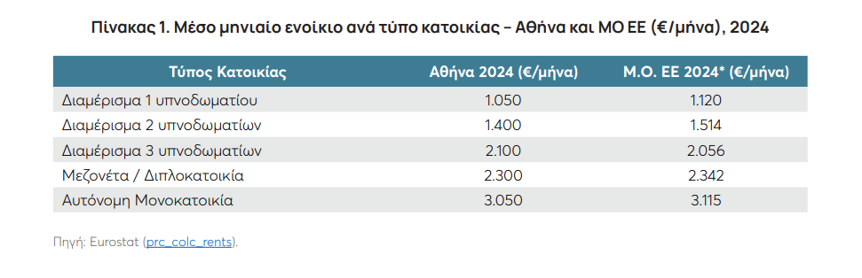 Ειδικότερα, στην Αθήνα για παράδειγμα το μέσο μηνιαίο ενοίκιο για διαμέρισμα με ένα υπνοδωμάτιο ανερχόταν σε €1.050 το 2024, ενώ για διαμέρισμα με δύο υπνοδωμάτια ανερχόταν σε €1.400 και για αυτόνομη μονοκατοικία σε €3.050.