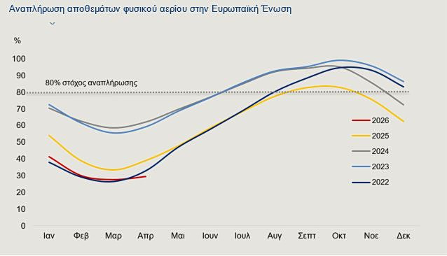 Προκειμένου να επιτευχθεί ο στόχος αναπλήρωσης στο 80% πριν από την έναρξη της επόμενης περιόδου θέρμανσης, οι εταιρείες φυσικού αερίου της Ευρωπαϊκής Ένωσης (ΕΕ) θα πρέπει να εισαγάγουν αρκετό φυσικό αέριο για να καλύψουν το υπόλοιπο 50% των αποθεμάτων το ερχόμενο καλοκαίρι. Η επίτευξη του στόχου του 80% έως την έναρξη της περιόδου θέρμανσης του 2026 ήταν εξ αρχής μια πρόκληση, ωστόσο ο πόλεμος στο Ιράν έχει περιπλέξει σημαντικά τις προοπτικές.