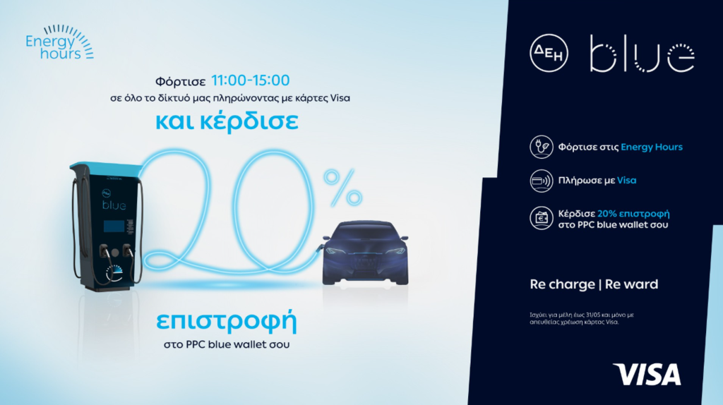 Συγκεκριμένα, όπως αναφέρεται σε σχετική ανακοίνωση, οι οδηγοί που φορτίζουν το όχημά τους στο δημόσια προσβάσιμο δίκτυο ΔΕΗ blue, καθημερινά στις Energy Hours, από τις 11:00 έως τις 15:00 και πραγματοποιούν τις συναλλαγές τους με κάρτα Visa, εξασφαλίζουν επιστροφή 20% στο PPC blue wallet τους.