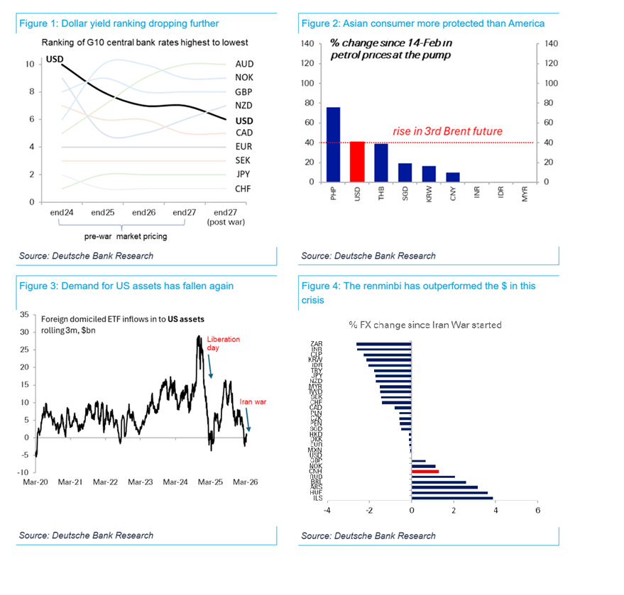 Τέλος, η Deutsche Bank επισημαίνει έναν ακόμη πιθανό παράγοντα πίεσης για το δολάριο. Την ενίσχυση του λεγόμενου «petroyuan». Αν και η νέα γεωπολιτική ισορροπία στη Μέση Ανατολή παραμένει αβέβαιη, μια πιθανή μετατόπιση από το σύστημα του «πετροδολαρίου» προς έναν μεγαλύτερο ρόλο της Κίνας, τόσο ως εγγυητή ασφάλειας όσο και ως παρόχου υποδομών πληρωμών, θα μπορούσε να οδηγήσει σε σημαντικές αλλαγές στη διεθνή κυριαρχία του δολαρίου.