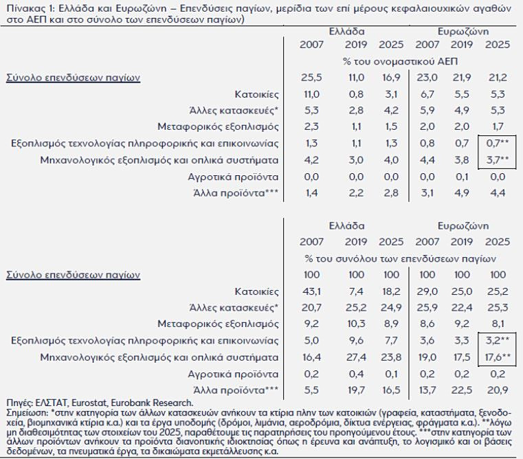 Εξάγεται το συμπέρασμα, ότι η πρώτη φάση της ανάκαμψης των επενδύσεων παγίων της ελληνικής οικονομίας διακρίνεται από τη σημαντική συνεισφορά των κατοικιών, των άλλων κατασκευών (π.χ. έργα υποδομής) και του μηχανολογικού εξοπλισμού και των οπλικών συστημάτων. Εν μέρει αυτό ήταν αναμενόμενο, καθότι ο κλάδος των κατασκευών εν συνόλω υπέστη πολύ μεγάλες απώλειες κατά τη διάρκεια της κρίσης χρέους. Όπως παρουσιάζεται στον Πίνακα 1, το 2019 οι επενδύσεις σε κατοικίες διαμορφώθηκαν στο 0,8 του ονομαστικού ΑΕΠ, έναντι 5,5% στην Ευρωζώνη. Το 2025 ενισχύθηκαν στο 3,1% του ΑΕΠ, παραμένοντας, ωστόσο, σε χαμηλότερο επίπεδο σε σύγκριση με την Ευρωζώνη (5,3%). Παράλληλα, το «πάγωμα» των επενδύσεων στους νευραλγικούς τομείς των υποδομών και της εθνικής άμυνας την περασμένη δεκαετία, τομέων με ισχυρές θετικές εξωτερικές οικονομίες (υπό την προϋπόθεση ότι οι πόροι αξιοποιούνται αποτελεσματικά, ήτοι δεν υπάρχει σπατάλη), δημιούργησε ισχυρές ανάγκες για νέες επενδύσεις.