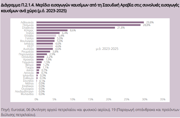 Οι εισαγωγές καυσίμων από τη Σαουδική Αραβία αποτελούν σχεδόν το 30% των συνολικών εισαγωγών της Λιθουανίας και της Πολωνίας σε καύσιμα, ενώ υψηλό μερίδιο έχει και η Σλοβενία με 21,8%. Η Ελλάδα εισάγει το 5,4% των καυσίμων της (όλων των ειδών) από τη Σαουδική Αραβία, με το μέσο όρο της ΕΕ27 να είναι στο 4,6%.