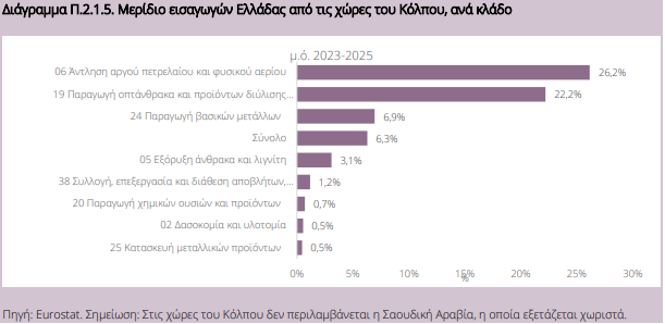 Εκτός από τον κλάδο 6 και κλάδο 19 που αφορούν τα καύσιμα, η Ελλάδα εισάγει το 6,9% των βασικών μετάλλων από τις χώρες του Κόλπου και το 3,1% στον κλάδο άνθρακα και λιγνίτη, ενώ στους υπόλοιπους κλάδους τα μερίδια είναι χαμηλά. Ειδικά σε σχέση με τα λιπάσματα, των οποίων οι εμπορικές ροές παρεμποδίζονται από το κλείσιμο του Στενού του Ορμούζ, η προέλευση των ελληνικών εισαγωγών είναι κυρίως από χώρες εκτός του Κόλπου, όπως η Αίγυπτος με μερίδιο περίπου 29% τη διετία 2024-2025, με αποτέλεσμα η έκθεση να προκύπτει έμμεσα από τη διακύμανση των διεθνών τιμών. Σημειώνεται ότι οι εισαγωγές της Ελλάδας σε λιπάσματα ξεπερνούν τα €400 εκ. τη διετία 2024-2025, ενώ το μερίδιο των χωρών του κόλπου είναι σχεδόν μηδενικό. Αντίστοιχα, οι εισαγωγές της ΕΕ27 από τις χώρες του κόλπου είναι πολύ χαμηλές (<2% του συνόλου), καθώς εισάγεικυρίως από τη Ρωσία (24%) και την Αίγυπτο (16%).