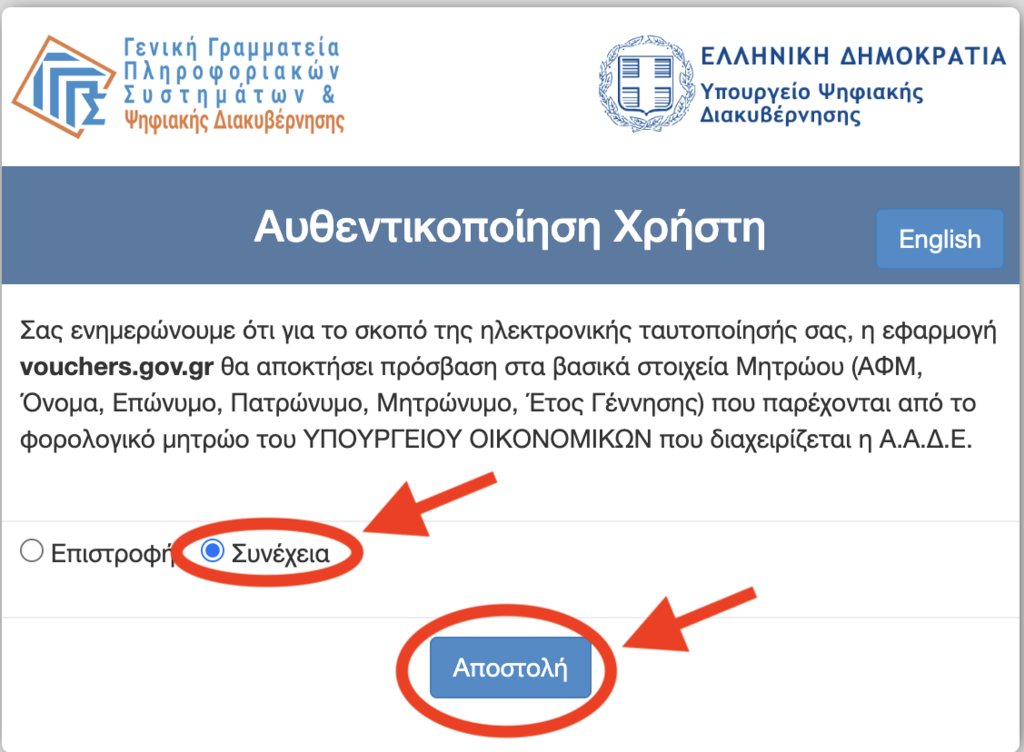 • Κωδικό μιας χρήσης με γραπτό μήνυμα (SMS) στο κινητό τους για την επιβεβαίωση δήλωσης των στοιχείων τους