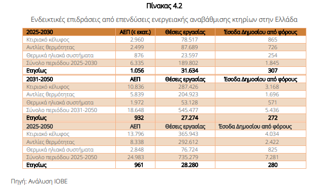Σε ορίζοντα ολόκληρης της περιόδου 2025-2050, οι επενδύσεις ενεργειακής αναβάθμισης δύνανται να ενισχύσουν το ΑΕΠ κατά σχεδόν 25 δισ. ευρώ, να στηρίξουν πάνω από 735.000 θέσεις εργασίας και να αποφέρουν περισσότερα από 7,2 δισ. ευρώ σε δημόσια έσοδα. Σε ετήσια βάση, αυτό μεταφράζεται σε μέση συνεισφορά περίπου 961 εκατ. ευρώ στο ΑΕΠ, 28.280 θέσεις εργασίας και 280 εκατ. ευρώ σε φορολογικά έσοδα.