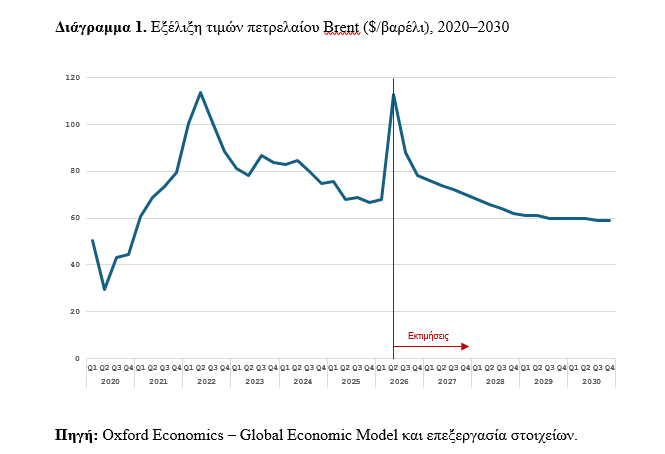 Η αναθεώρηση του βασικού σεναρίου στηρίζεται στη λογική του αρχικού Σεναρίου Α που είχαμε δείξει στην παραπάνω ανάλυση, δηλαδή ενός βραχυχρόνιου σοκ, αλλά με σημαντική προσαρμογή της διαδρομής των τιμών του πετρελαίου σύμφωνα με τις πρόσφατες εκτιμήσεις της Oxford Economics (Oxford Economics – World Economic Prospects, 13 April 2026).