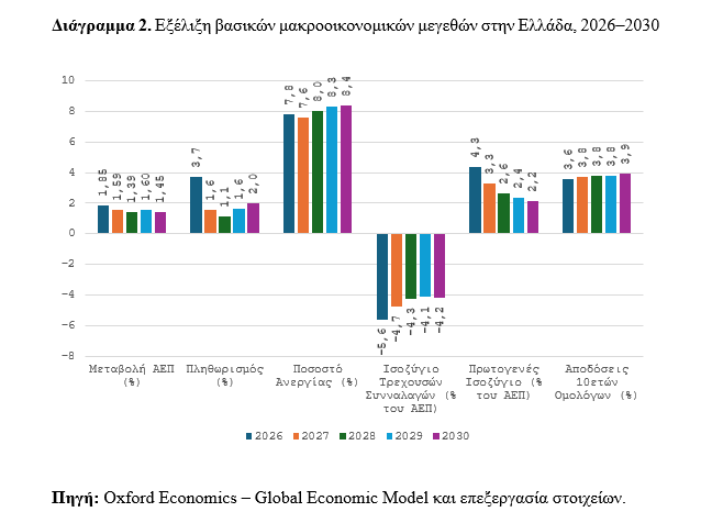 Οι επιπτώσεις αυτές αποτυπώνονται στα βασικά μακροοικονομικά μεγέθη της ελληνικής οικονομίας. Ο ρυθμός μεγέθυνσης διαμορφώνεται στο 1,85% το 2026 και στο 1,59% το 2027, ενώ στη συνέχεια κινείται κοντά στο 1,4%–1,6% έως το 2030, υποδηλώνοντας μια περίοδο χαμηλότερης αλλά σχετικά σταθερής ανάπτυξης.