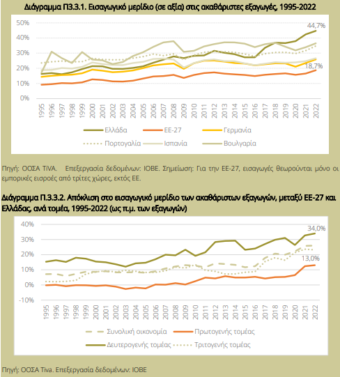 Από τα μέσα της δεκαετίας του 1990 έως το 2022, το εισαγωγικό μερίδιο στις ελληνικές εξαγωγές ακολουθεί σαφή ανοδική πορεία. Το ποσοστό της αξίας που ενσωματώνει εισαγόμενες εισροές αυξάνεται σταθερά, φτάνοντας το 44,7% το 2022, από περίπου 24,7% το 1995. Η Ελλάδα κινείται διαχρονικά πάνω από τον μέσο όρο της ΕΕ-27, ενώ χώρες όπως η Πορτογαλία και η Ισπανία καταγράφουν χαμηλότερα επίπεδα. Η Βουλγαρία, αν και ξεκίνησε από χαμηλότερη βάση, εμφανίζει επίσης σημαντική άνοδο.