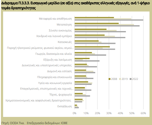 Αξιοσημείωτη είναι η συνολική άνοδος του εισαγωγικού μεριδίου της οικονομίας την περίοδο μετά την κρίση. Από το 2008 έως το 2022, η αύξηση φτάνει σχεδόν τις 8 ποσοστιαίες μονάδες, ένδειξη ότι η αναδιάρθρωση της οικονομίας συνοδεύτηκε από μεγαλύτερη διασύνδεση με διεθνείς προμηθευτές.