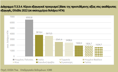 Στο Διάγραμμα παραπάνω διάγραμμα παρουσιάζονται οι κύριοι εξαγωγικοί προορισμοί της Ελλάδας το 2022, με βάση την προστιθέμενη αξία που ενσωματώνεται στις ακαθάριστες εξαγωγές, εκφρασμένη σε εκατομμύρια δολάρια. Πέρα από τα υπόλοιπα κράτη-μέλη της Ευρωπαϊκής Ένωσης (με το μεγαλύτερο μερίδιο και συνολική προστιθέμενη αξία εξαγωγών στα 19.497,5 εκατ. δολάρια το 2022), η ανάλυση αναδεικνύει σχετικά μεγαλύτερη συγκέντρωση των εξαγωγικών ροών προς τις Ηνωμένες Πολιτείες οι οποίες αποτελούν τον σημαντικότερο προορισμό εκτός Ευρώπης, απορροφώντας σε διαχρονικό ορίζοντα σημαντικό μέρος της εγχώριας προστιθέμενης αξίας.