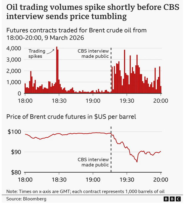 Η συνέντευξη έγινε γνωστή στο κοινό στις 19:16 GMT, όταν δημοσιογράφος ανάρτησε σχετική πληροφορία. Αμέσως μετά, η τιμή του πετρελαίου κατέρρευσε περίπου κατά 25%, καθώς οι αγορές αντέδρασαν στην προοπτική ταχύτερης λήξης της σύγκρουσης.