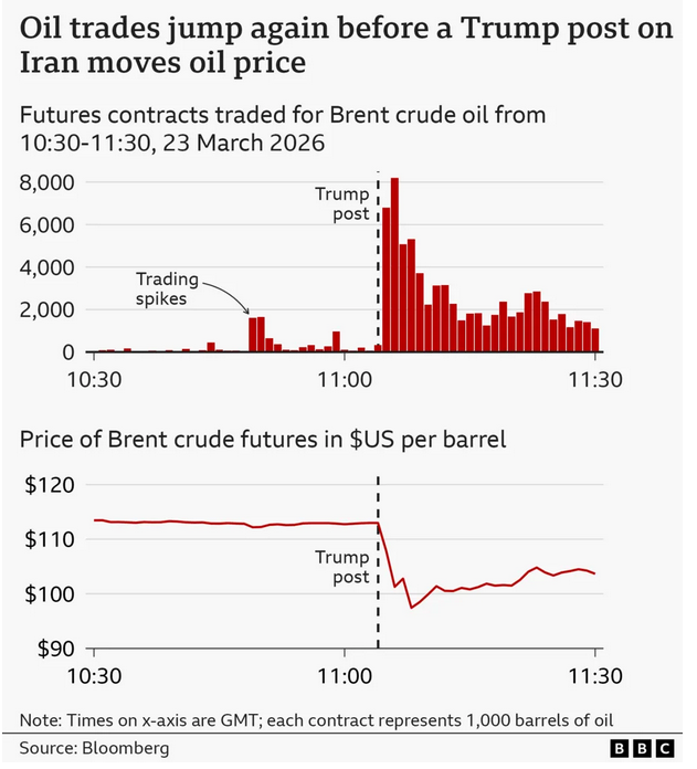 Η τελευταία έρευνα του BBC, βασίστηκε σε δεδομένα όγκου συναλλαγών σε διάφορες χρηματοπιστωτικές αγορές. Τα οποία και συνέδεσε με ορισμένες από τις σημαντικότερες δηλώσεις του προέδρου που επηρέασαν τις αγορές. Το αποτέλεσμα δείχνει ένα επαναλαμβανόμενο μοτίβο… απότομες αυξήσεις στις συναλλαγές καταγράφονται ώρες, ή ακόμη και λεπτά, πριν από αναρτήσεις στα μέσα κοινωνικής δικτύωσης ή δημόσιες δηλώσεις.