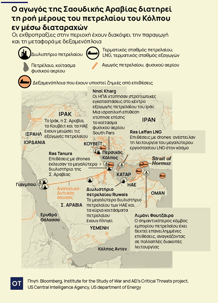 Με περισσότερα από 200 μεγάλα δεξαμενόπλοια να παραμένουν ακινητοποιημένα στον Κόλπο, οι χώρες της περιοχής έχουν διακόψει το μεγαλύτερο μέρος της παραγωγής πετρελαίου, καθώς δεν υπάρχει πλέον χώρος στις δεξαμενές.