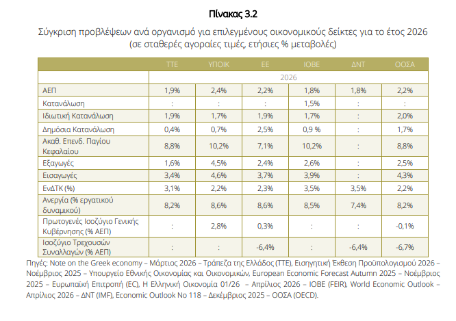 Στο πεδίο της ανάπτυξης, οι εκτιμήσεις κινούνται σε σχετικά στενό εύρος. Η Τράπεζα της Ελλάδος προβλέπει αύξηση του ΑΕΠ κατά 1,9%, το ΙΟΒΕ και το ΔΝΤ στο 1,8%, ενώ πιο αισιόδοξες εμφανίζονται η Ευρωπαϊκή Επιτροπή και ο ΟΟΣΑ, που τοποθετούν την ανάπτυξη στο 2,2%, με τους δύο τελευταίους οργανισμούς να μην έχουν συμπεριλάβει τις επιπτώσεις του πολέμου. Το ίδιο ισχύει και για τις προβλέψεις του υπουργείου Εθνικής Οικονομίας και Οικονομικών, το οποίο ετοιμάζεται να κατεθέσει νέες προς την Κομισιόν στις 30 Απριλίου.